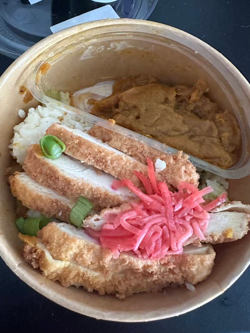 If you're looking to spend over budget on some soggy chicken with a weird texture. Let me introduce the Katsu curry. A little bit of sour pickle thrown on top to complement the dish and some congealed curry on the side. Rice that clumped together in an overal bland unsalted dish.